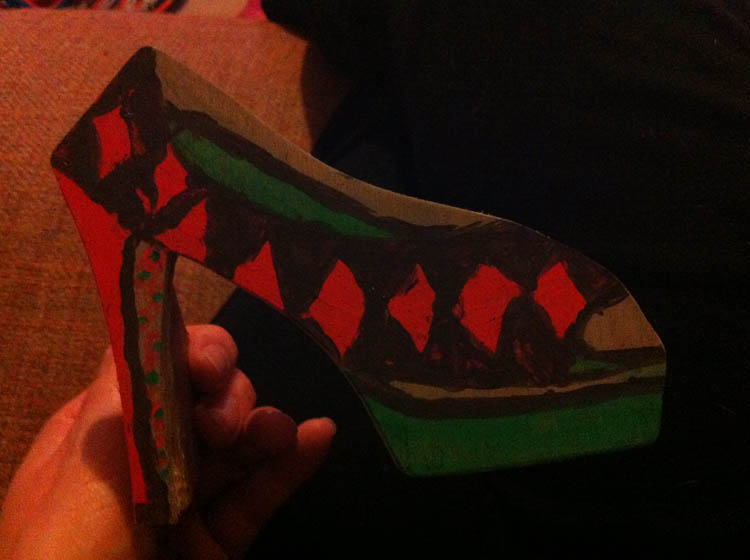 Dochter S. had nog een cadeautje voor moederdag gemaakt. Een speciaal ontworpen schoen van hout, in mijn kleuren en stijl!