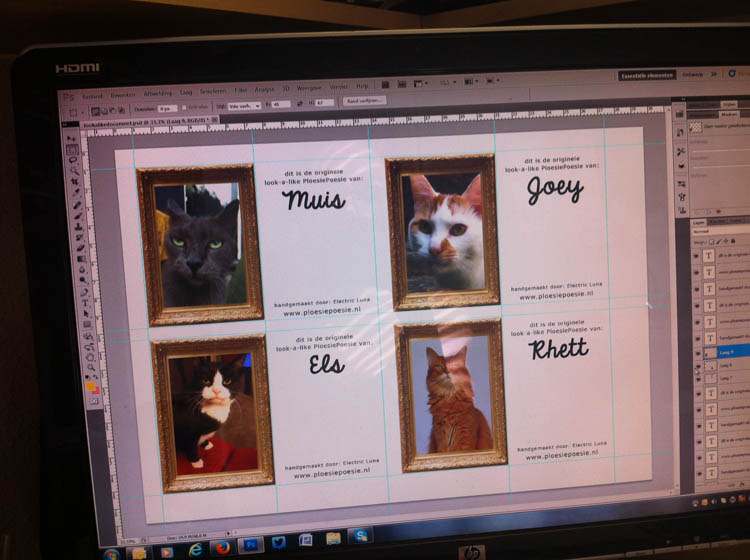 Ik moet echt weer ontzettend in de Ploesie-business inkomen. Al m’n documenten zijn kwijt of niet meer te openen, dus die moet ik opnieuw maken. Aan elke PloesiePoesie hangt een kaartje (‘dit is de originele PloesiePoesie van…’) en die bouw ik opnieuw in Photoshop. Ook kan ik m’n snijmat, m’n stanleymes en m’n hoekponsje niet vinden, dus ik ben lekker bezig! Maar… gevonden, dus ik kan in de toekomst alles wat makkelijker en sneller regelen.