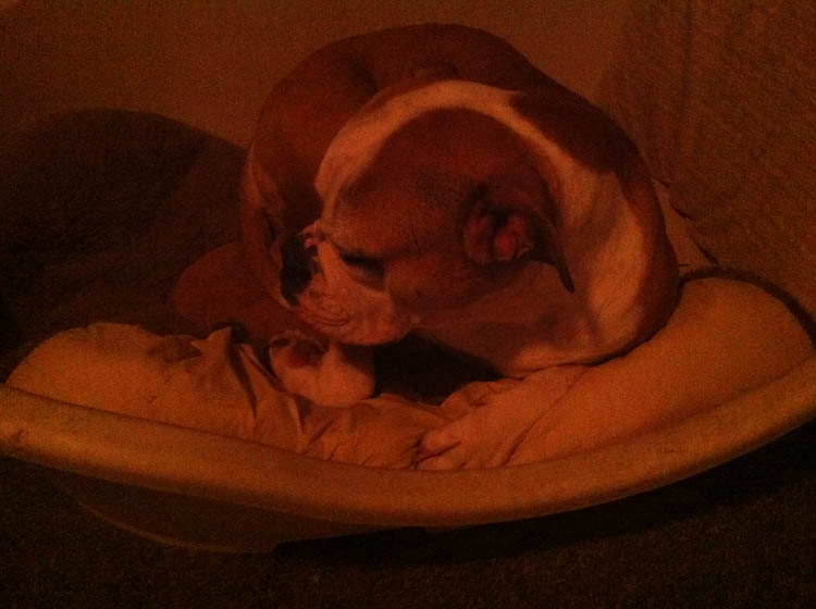 Thuis nog even wat hangen op de bank (de echtgenoot is weer in een nieuwe serie begonnen, iets met een boot en chemische oorlogvoering en een virus en gedoe, veel gedoe). Ik lees een boek op m’n e-reader (De overgave van Floor) (ik weet nog niet wat ik ervan vind, het gaat over BDSM en is een soort Nederlandse Fifty Shades of Grey). Nina droomt over Diego, zwemmen en stokken zoeken.