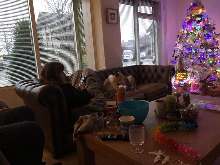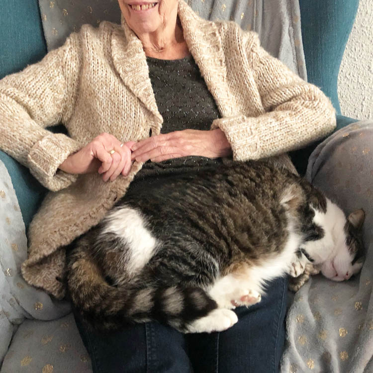 M’n ouders komen bij ons eten op Eerste Kerstdag. We hebben het allemaal gedacht; m’n moeder haalt deze kerst niet eens. Maar kijk; ze is er nog! En ze kan nog prima een kater van een kilo of eh, teveel, op haar schoot hebben!