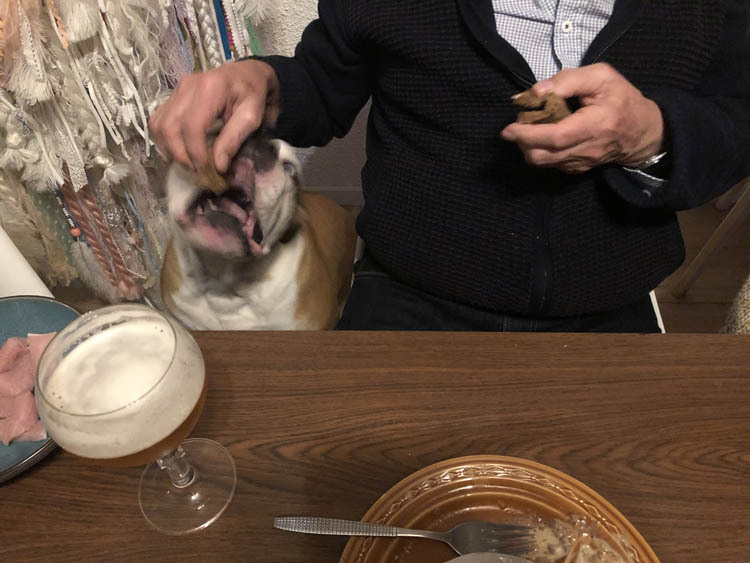 Kerstavond gaan we naar m’n ouders. Nina krijgt hier een boterham, maar we doen net alsof het een croissantje is.