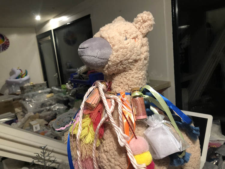 M’n vriendinnetje J. gaat trouwen! HOERA!!!! Ik versier een alpaca met linten en flesjes met opgerold geld en een brief! M’n moeder gaf vroeger ook nooit geld voor een verjaardag, maar ze maakte er altijd iets creatiefs van.
