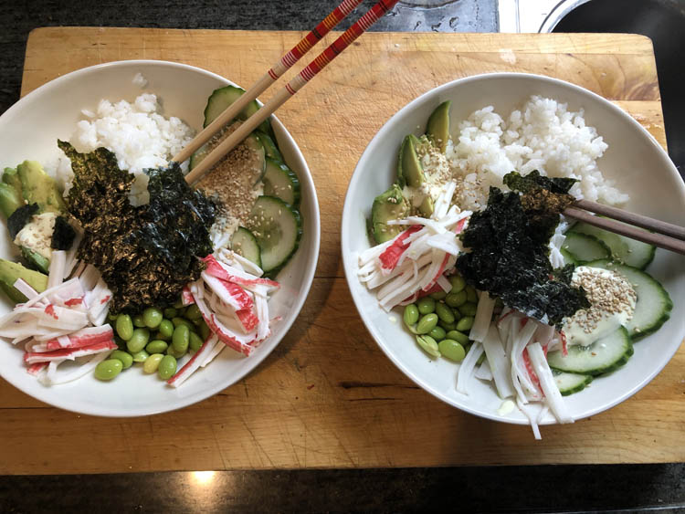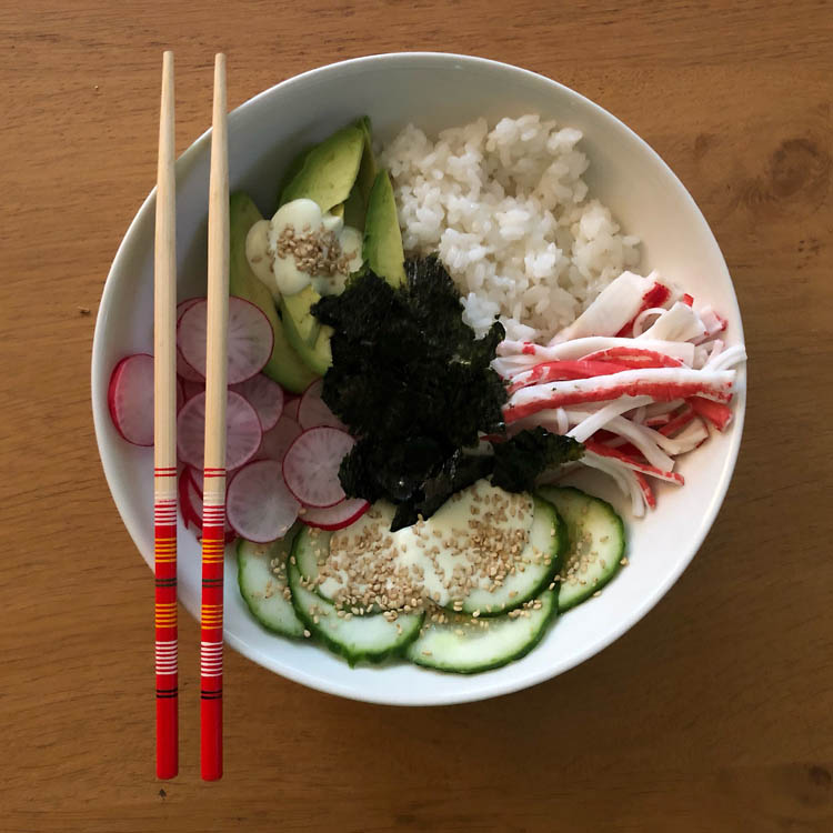Dat is een nori-vel in stukjes gescheurd, zodat het ook echt als sushi smaakt als je van alles een beetje neemt!