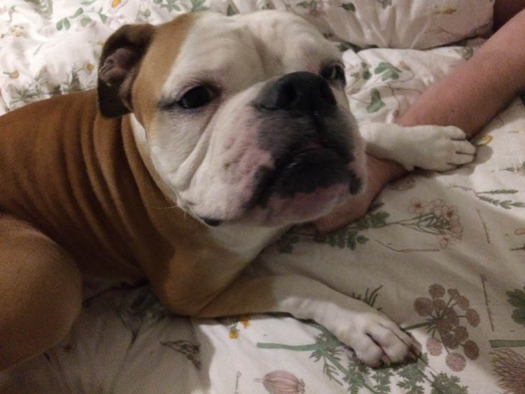 Zondagochtend. Bruce heeft een nieuwe hangplek gevonden. Onder de dekens, op het been van M.