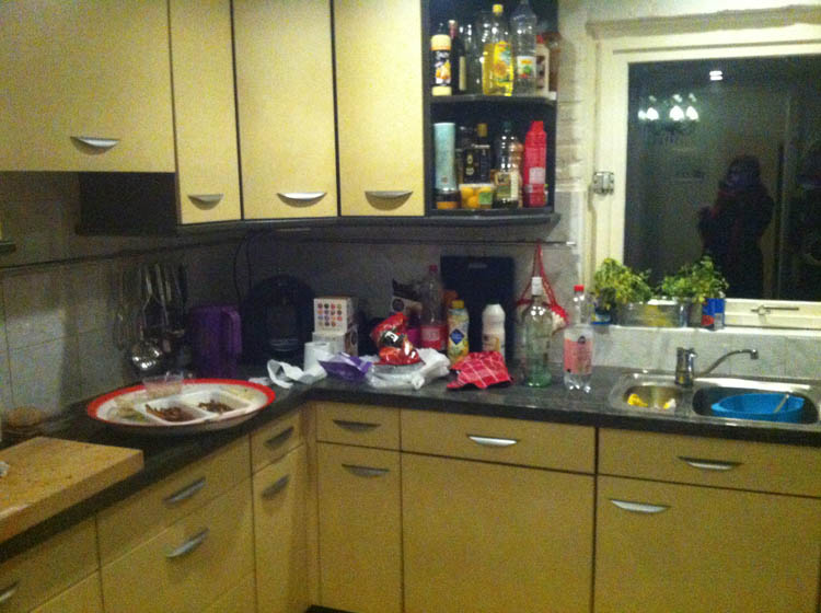 Dit is de ravage die onze keuken vaak is na een gemiddelde zaterdagavond. Zucht.