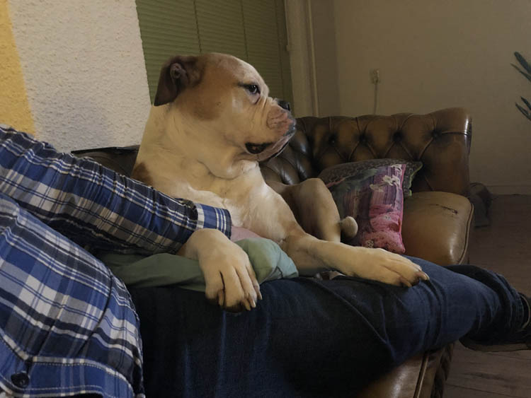 Kijk hier dan op de bank. Nina ligt met d’r poot op M., want; hij is van haar!