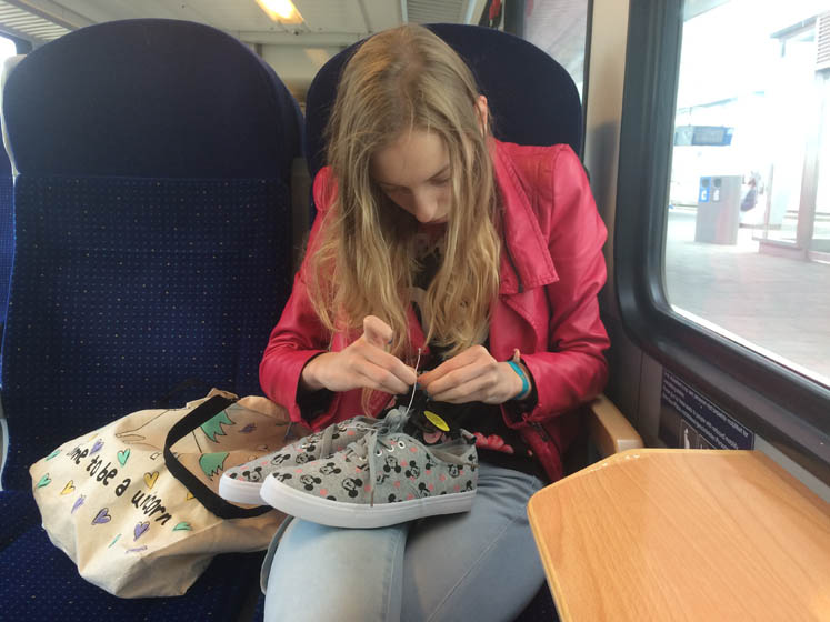 De puber kan niet wachten om haar nieuwe Mickey Mouse-schoenen aan te trekken. Nou vooruit dan maar.