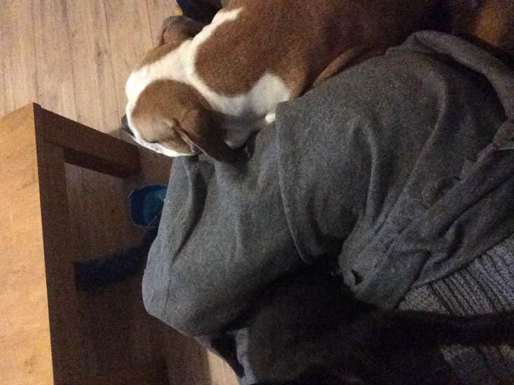 Hier is het alweer middag! Ik heb de oppaspuber uit school opgehaald en we zijn even samen naar de stad geweest om een cadeautje voor haar ouders te kopen (die waren 12,5 jaar getrouwd) en om een cadeautje voor haar zus te kopen (die is vandaag 18 geworden). HOERA! Hier heb ik Tiara op schoot, een hele knappe hond. Zelf voel ik me met de minuut zieker worden. Hoesten. Kuchen. ZIELIG!