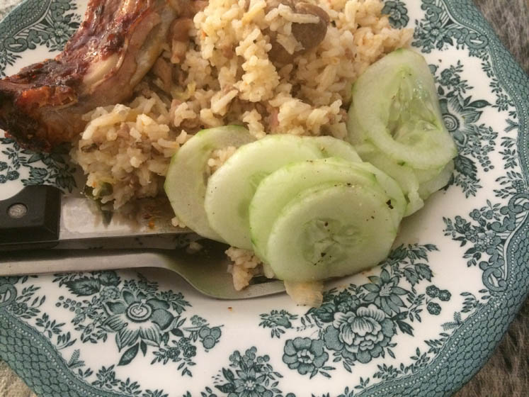 Hmmmm… dit was heel lekker en uit de diepvries, dus bonuspunten! De diepvries is echt bijna leeg, of in ieder geval; de bodem is in zicht! Ik vond nog een zak met gekruid nasivlees en een flinke gekruide sparerib! Goede combinatie met komkommer-salade uit eigen tuin!
