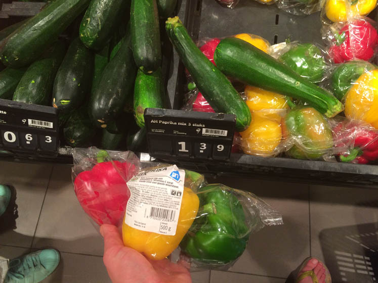 Hier kan ik ZO pissig om worden… we gaan nog even langs de Albert Heijn voor taart en komen langs de paprika’s. Hier een zak AH Paprika met 3 stuks, totaal 500 gram, voor € 1,39.