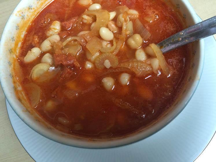 Maar ik eet zelf een kom van die heerlijke Spaanse bonensoep die ik gisteren maakte. Echt lekker!
