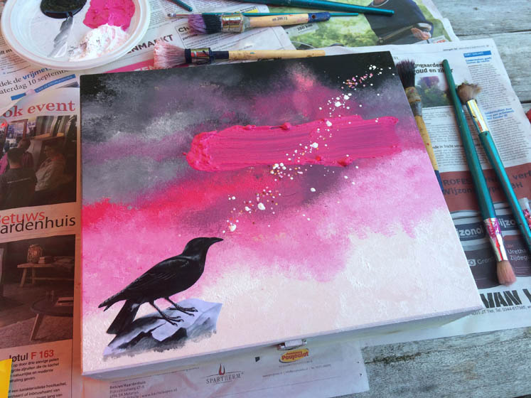 Dan naar buiten om weer een batch met Love Ritual Boxen te schilderen.