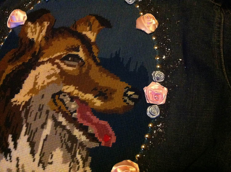 Ik ben de rest van de dag bezig met het maken van deze jas en hij is megagaaf geworden. Met heel veel gouden studs, bloemen en gouden glitters! De hond heeft subtiel een hartje op z’n tong gekregen, als een soortement van piercing. Of hij heeft het hart op de tong. Ik denk dat degene die ‘m besteld heeft er erg blij mee is. Morgen een betere foto bij daglicht.