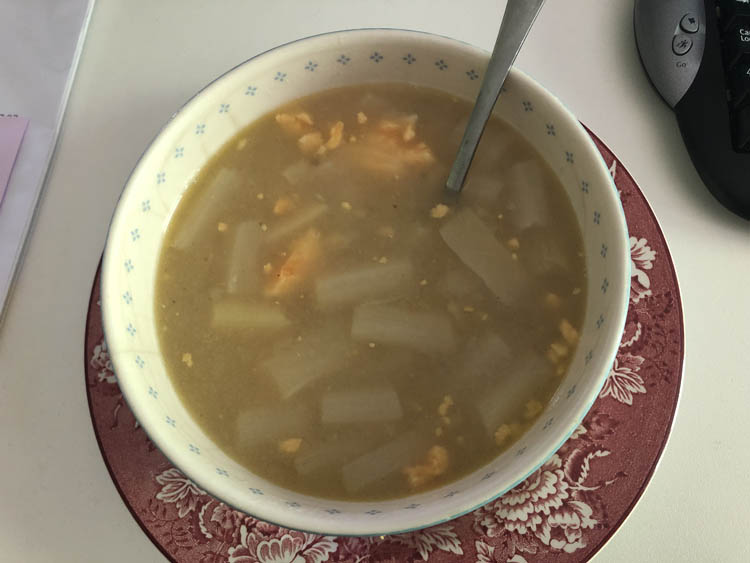 Verlate lunch uit de vriezer; aspergesoep! Dat was wel even een cadeautje.