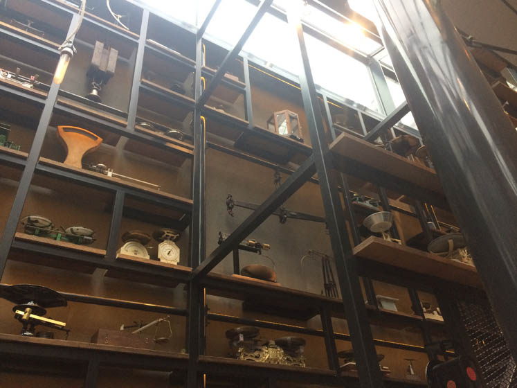 En wat leuk; 1 muur is helemaal versierd met allerlei oude weegschalen! Superkoel!