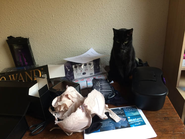 Stilleven met Bruce. Ik draag in verband met de jeuk al een paar weken geen bh’s meer. Of ik draag ze een uurtje en dan doe ik ze weer uit. Ik denk dat er wel 10 bh’s door het huis verspreid liggen. Overigens is er niets uit het bloedonderzoek gekomen. Ik ben dus helemaal nergens allergisch voor. En dat is mooi. Of eigenlijk ook weer niet, want dat betekent dat het waarschijnlijk stress of weet ik veel wat voor een ellende is die eruit komt. Nou ja, ik leg me er maar bij neer voor nu. Ik heb weer allerlei nieuwe sekstoys opgestuurd gekregen, dus ik heb het drukdrukdruk klaarkom-technisch gezien.