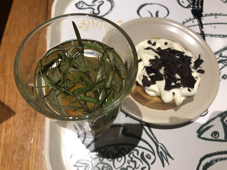 Omdat er van de rest van de dag werktechnisch toch niks meer komt gaan we even op pad voor thee en taart. Dit glas zou gemberthee moeten zijn. Nou, sorry hoor, maar als dit gemberthee is, dan ben ik het ook. Het is een glas met rozemarijn, een schijf sinaasappel en een stukje gember.
