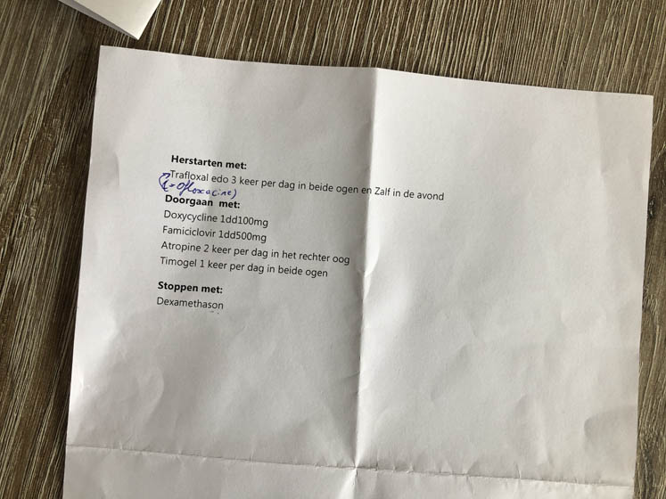 Ik ga even langs m’n ouders om te kijken hoe het nu is en er blijkt in huize Van den Heuvel een lichte paniek over hoe en wanneer en wat met al die pillen en zalfjes en druppels. Toen dit, nu dat en dat dan in hele kleine etiketjes op de doosjes en een heel klein lettertype, ja dat schiet natuurlijk niet op bij iemand die iets aan z’n ogen heeft hè? Ik schep even wat orde in de chaos en print een lijst uit in een groot lettertype.