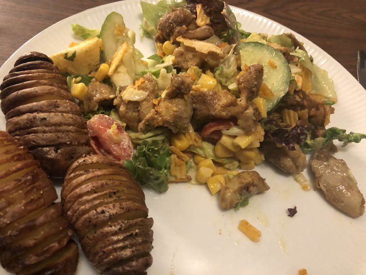 We eten… aardappeltjes uit de oven, een Indiase kip-salade en een rollade! Heerlijk!