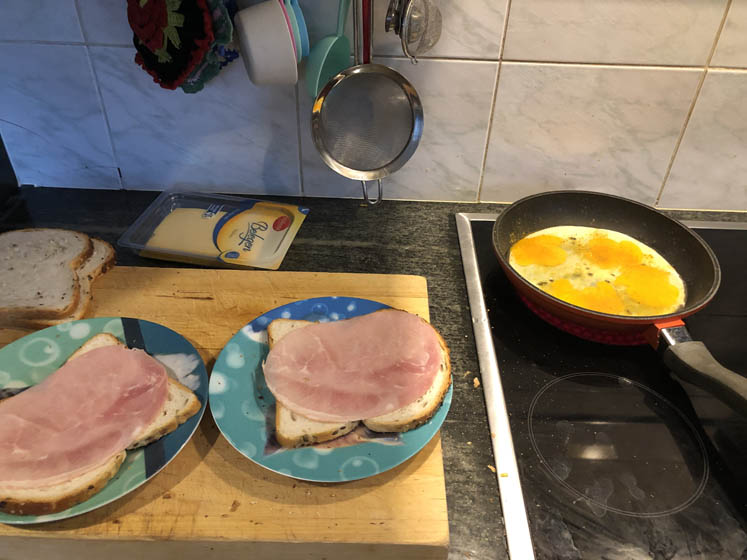 Zaterdag! Even rustig aan doen vandaag, want het gaat laat worden vanavond! Ontbijten met een omelet met kaas en ham; goede bodem!