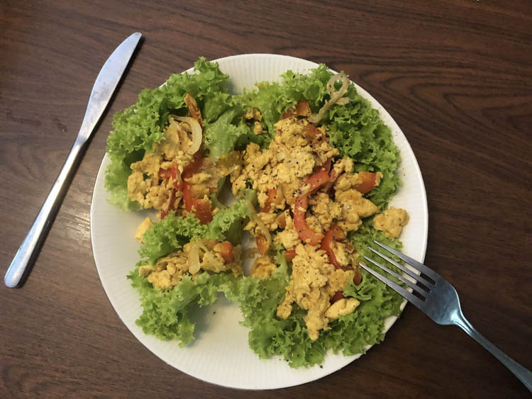 Dit ziet er uit als een heel kleurrijk ontbijtje. Roerei met paprika en uit op een bordje met sla. We gaan een poging doen om met koolhydraten te minderen hier in dit huishouden.