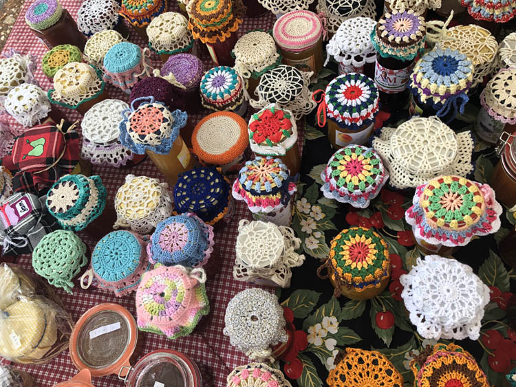 Er is een rommelmarkt in Zoelen en wij staan stipt om 9:00 bij de kerk! Ik was eigenlijk op zoek naar gehaakte kleedjes, maar de dames van de kerk hebben de kleedjes om potjes jam gedaan en ik ben geen fan van jam. Het ziet er wel heel kleurrijk uit.