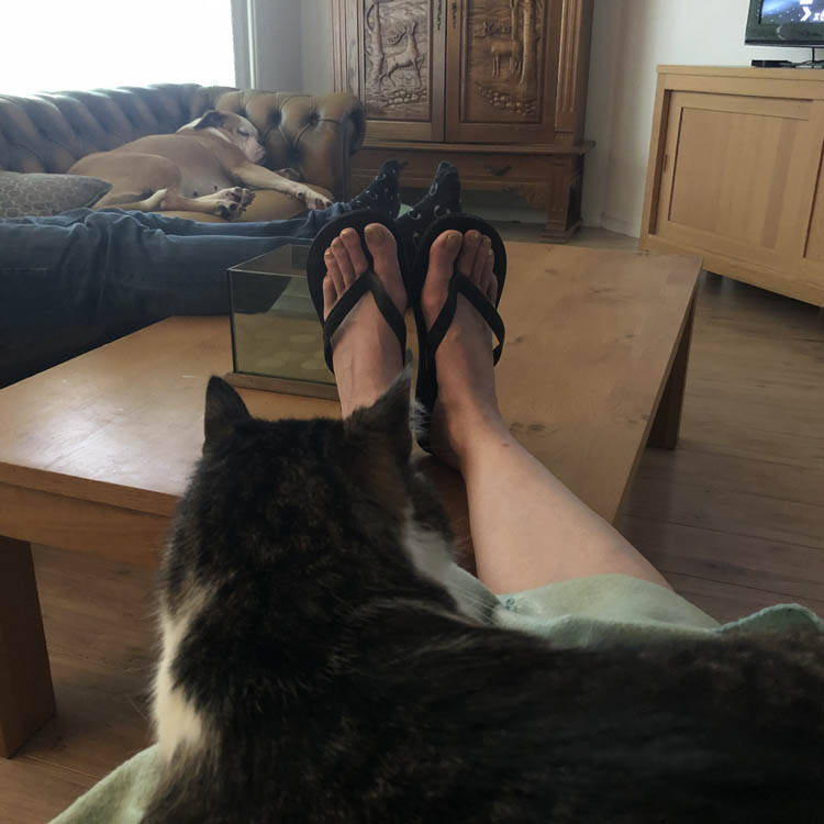 En dan met de pootjes omhoog en kat op schoot. Tv aan en verstand op 0.