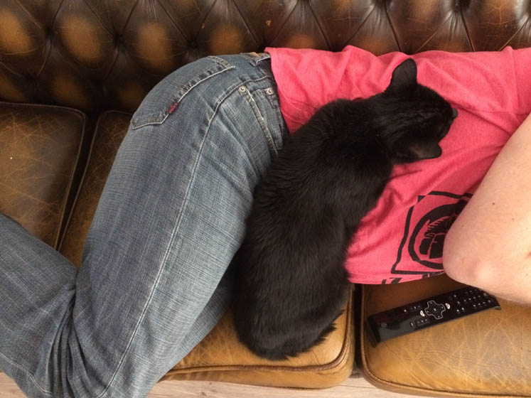 En dan eh, doet J. nog maar even een dutje op de bank met Bruce, want hij heeft moet zo nog een heel stuk rijden. Om de loungebank op te halen in Monster!! Dat is dan meteen mijn huwelijkscadeau, want eigenlijk zou de bank pas dinsdag komen, maar nu heb ik ‘m dus al vandaag! HOERA!