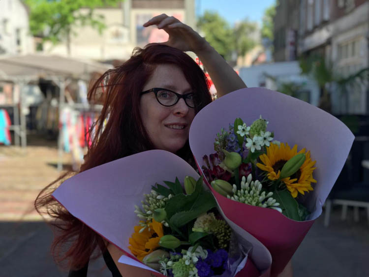 We halen een bos bloemen voor m’n moeder en een bos bloemen voor onze overbuurvrouw!