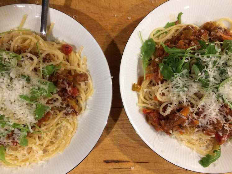 En wij eten een spaghetti met bolognesesaus uit de diepvries. Met verse rucola en Parmezaanse kaas. Dat dan weer wel. En we gaan om 21:30 naar bed. Op de zaterdag! Want; dus echt hard gewerkt vandaag.