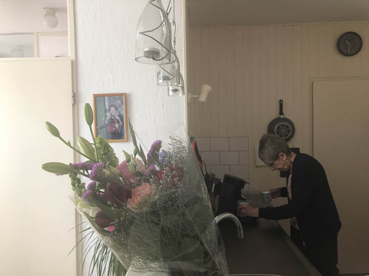 We halen daarna een bosje bloemen voor m’n moeder en brengen die langs! Meteen even een kopje koffie.