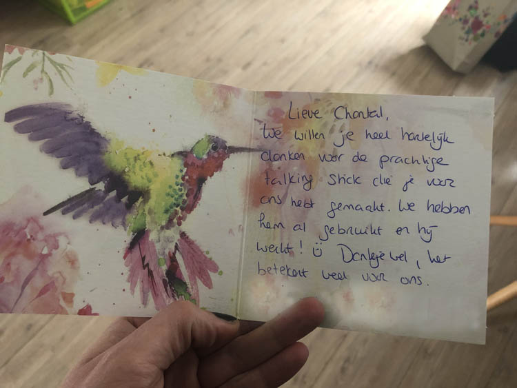 Daar tref ik dit bedankkaartje aan. Ik maakte ooit voor een stel dat verbleef in 1 van de Love Bubbles een custom made talking stick! Ze zijn er heel blij mee (dat is logisch, want hij was heel erg mooi en gaaf)! Maar… ik ben binnen de Love Bubble-zwerm de kolibri (iedereen die bij de Love Bubbles werkt wordt ‘ingewijd’ als vogel). Dat ik de kolibri ben, dat wisten deze mensen niet! Hoe bijzonder…