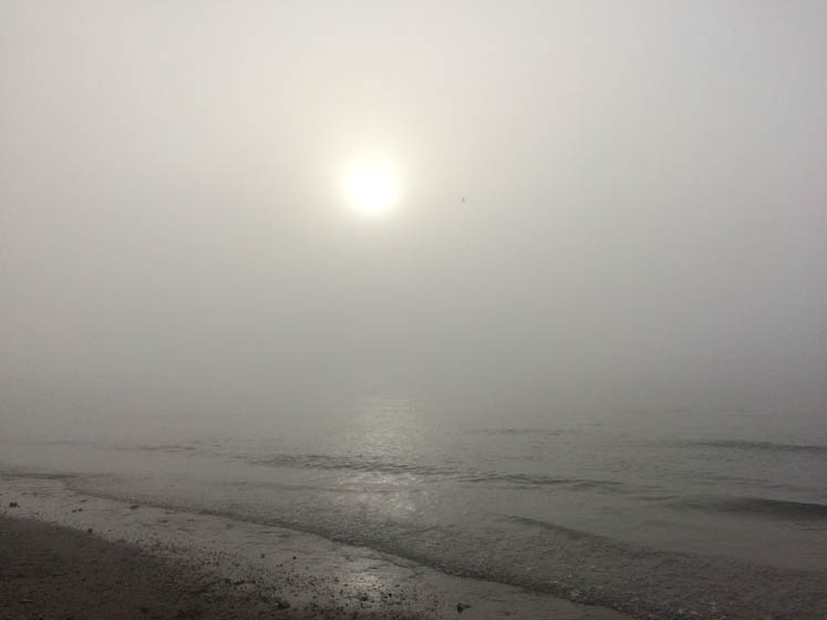 Het is héél erg mistig. Mochten er al boten op de Waal varen zo vroeg, dan kun je ze dus niet zien.