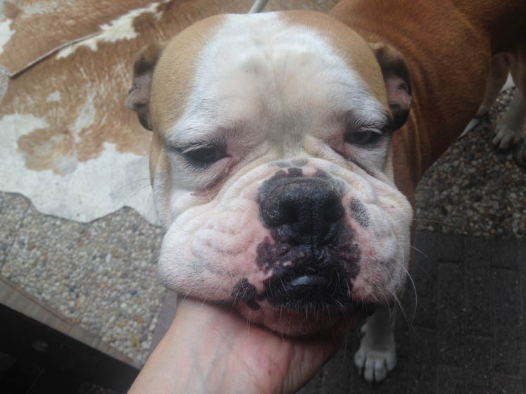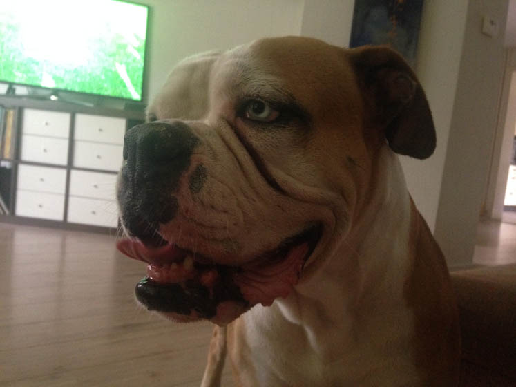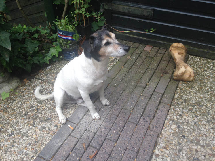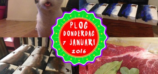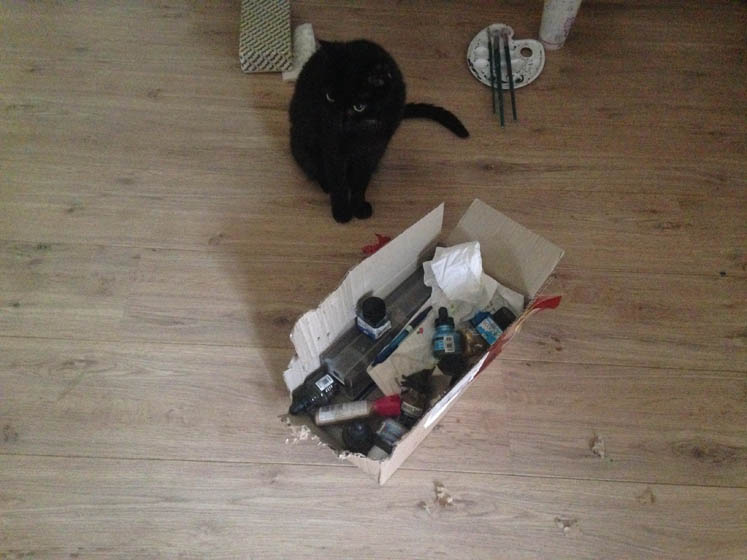 Dit is Bruce z’n manier om duidelijk te maken dat hij honger heeft; m’n doos met verf uit de kast rukken en slopen.
