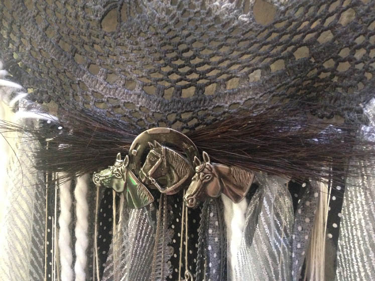Ik maak de dromenvanger voor Linda af! Een zwart-witte met een paardending erop. Inclusief haar van haar paard. Heel goed gelukt!