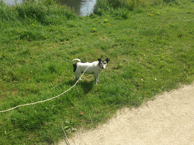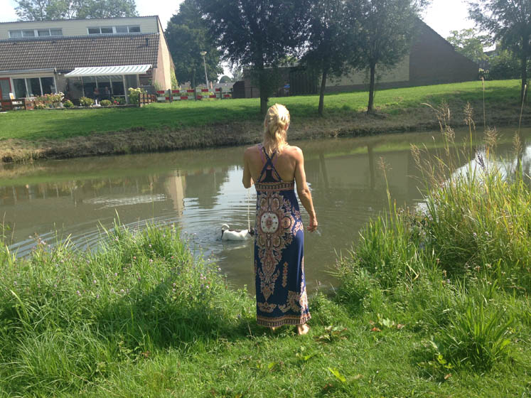 Scooby wil het liefst een stukje zwemmen, maar het water is een beetje vies.