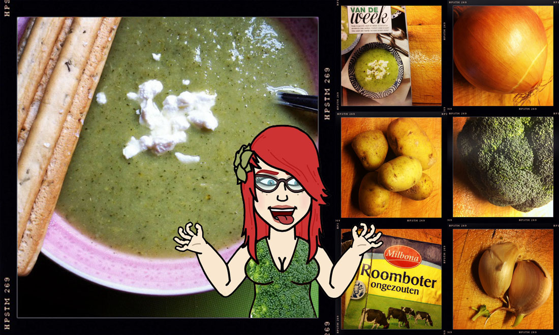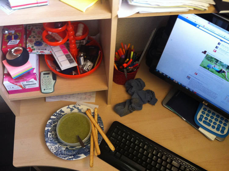 Ik ontbijt met een broccolisoepje met soepstengels. Lekker! Wat doen die sokken op mijn bureau? Ik weet het echt niet, maar ze liggen er nu nog.