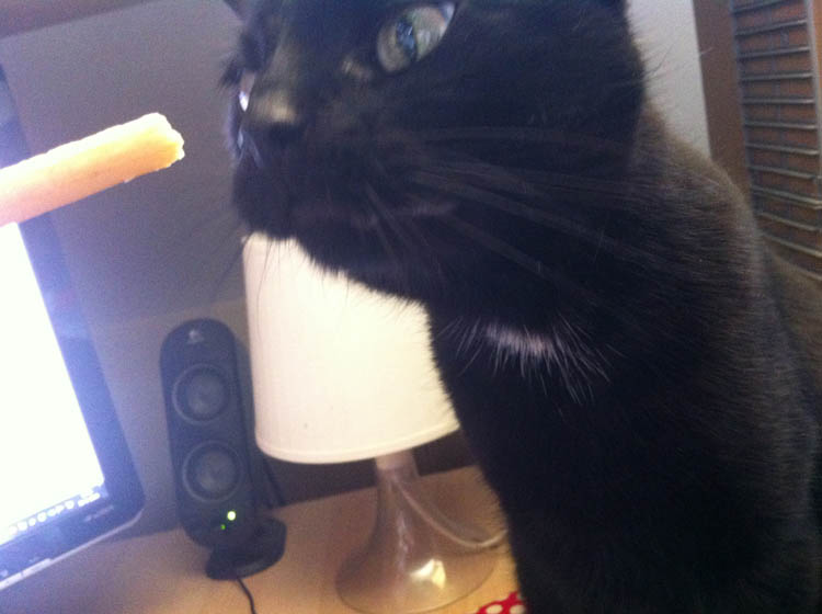 Bruce wil ook een stuk soepstengel. Mag niet. Hij likt later wel m’n bakje schoon. Mag eigenlijk ook niet.