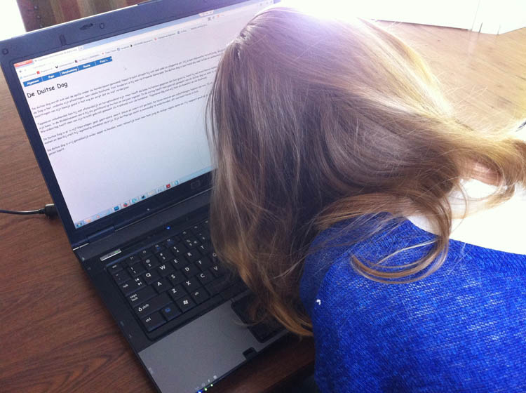 Oppasmeisje M. is de hele middag druk met haar spreekbeurt. Ze doet het toch maar niet over drop, maar over de Duitse Dog, want ze heeft thuis een Duitse Dog en die kan ze dan tijdens haar spreekbeurt laten zien. Ja, dat zou ik ook wel gaaf vinden.