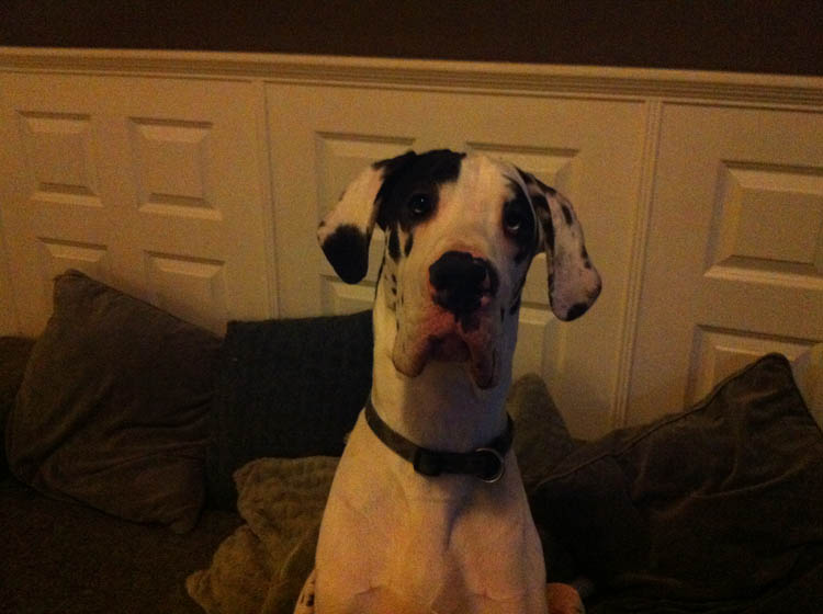 Omdat er familiebezoek komt bij oppasmeisje M. blijft ze vanavond niet slapen. Ik breng haar op de fiets naar huis en praat nog even met haar ouders en ik zet Elvis op de foto. Yep, ik zou mijn spreekbeurt ook over Duitse Doggen houden!