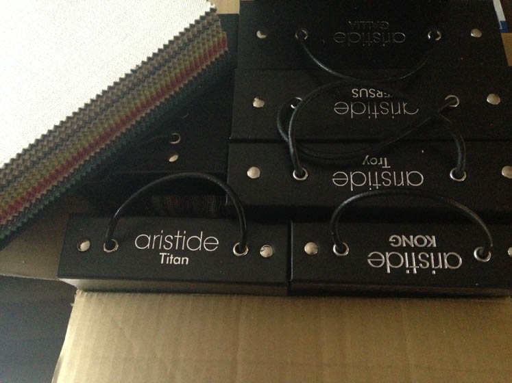En dan wordt er ineens aangebeld en als ik de deur opendoe staat er een enorme doos met allemaal meubelstof-stalen voor de deur! Ik zie nog net mijn overbuurvrouw wegrijden. OMG! OMG! Het zijn wel 10 boeken met allerlei nepleer, weet ik veel wat voor geweldige dikke stoffen in allerlei kleuren! WOW! Ik kan nu helemaal los met m’n armbandjes!! Dankjewel lieve overbuuf!!!