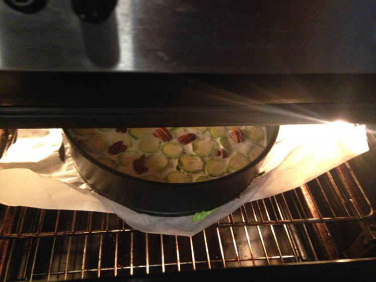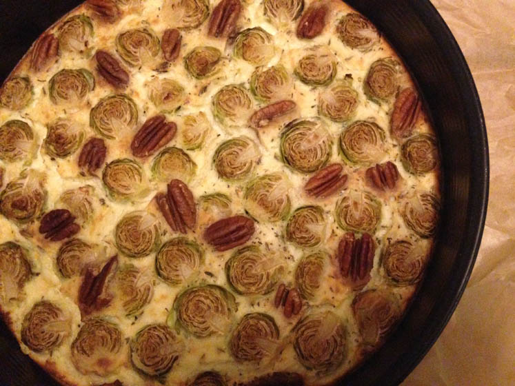 Hier word ik ook nog blij van. Het is een spruitjes-clafoutis met pecannoten. Zonder vlees, maar met Parmezaanse kaas en ricotta.