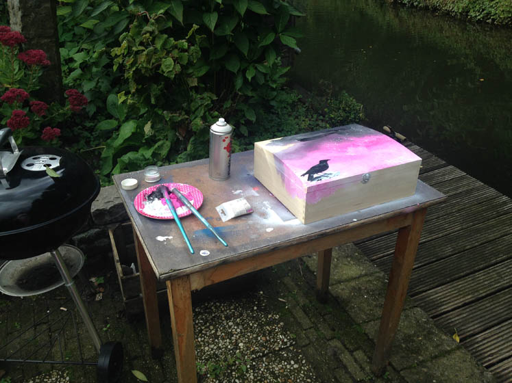 Tussen de buien door schilder ik de eerste 12 wijnkisten.