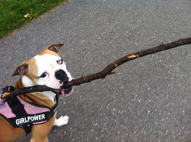 Dit is het hoofd van een blije hond. Ze mocht de stok mee naar huis nemen, maar moest ‘m wel voor de deur neerleggen.