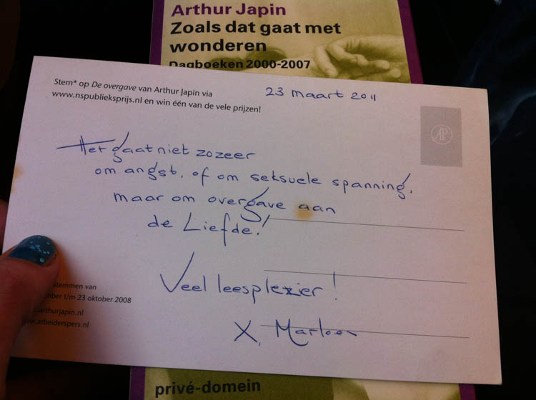 Ik heb het boek ‘Zoals dat gaat met wonderen’ van Arthur Japin meegenomen. Al een paar keer gelezen, maar het blijft een heerlijk boek om in te bladeren, op zoek naar de prachtige oneliners van Arthur Japin. Ik kreeg het boek 3 jaar geleden van Marloes en vindt haar kaartje als bladwijzer tussen de pagina’s.